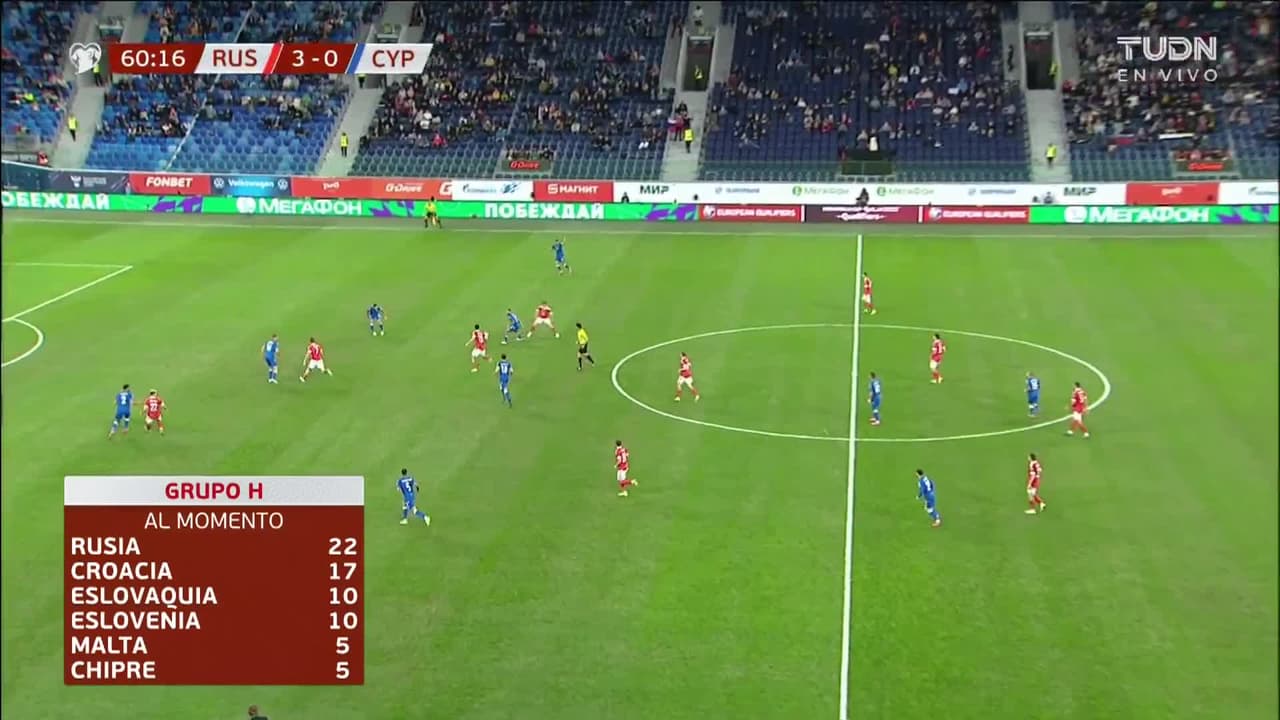 Tiro atajado raso al centro del arco. Aleksandr Erokhin (Rusia) Disparo con la derecha desde el centro del área. Asistencia de Roman Zobnin.
