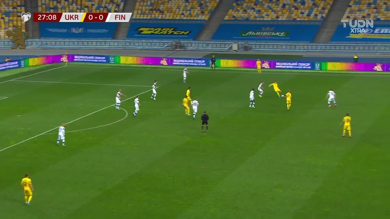 Tiro atajado al ángulo superior derecho. Oleksandr Zinchenko (Ucrania) zurdazo desde fuera del área. Asistencia de Yevhenii Makarenko.