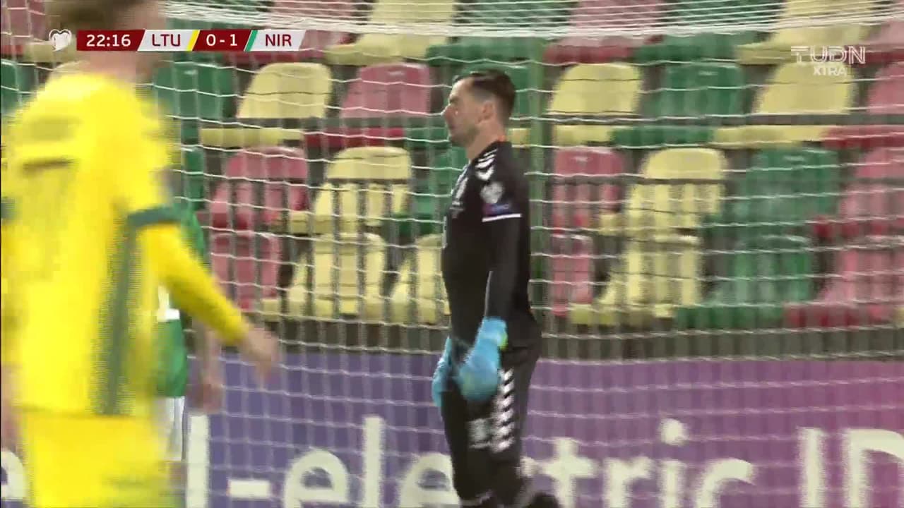Remate parado junto al lado derecho de la portería. Alistair McCann (Irlanda del Norte) remate con la derecha desde fuera del área. Asistencia de Conor Washington.