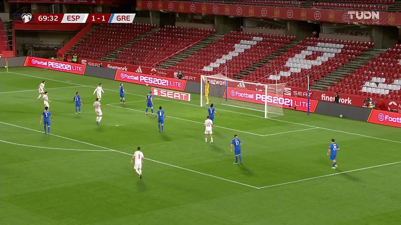 Tiro atajado. Álvaro Morata (España) disparo de cabeza desde el centro del área.