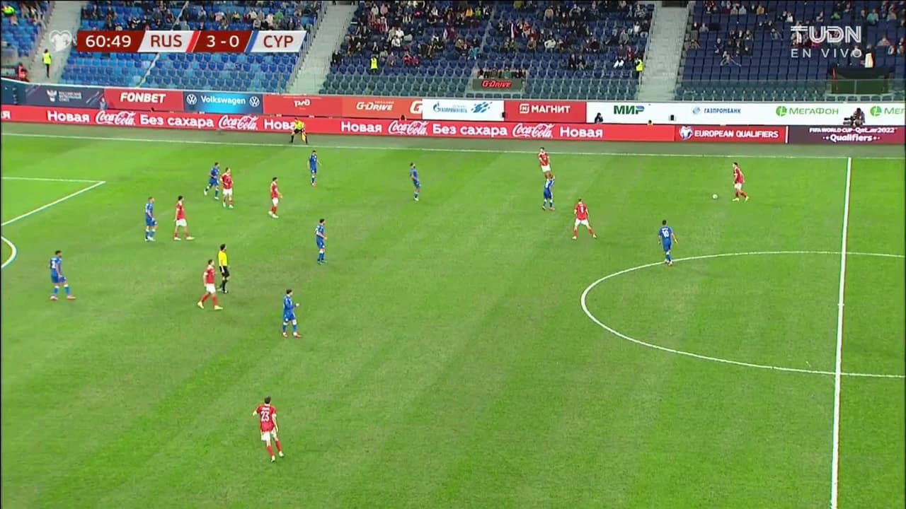 Tiro atajado raso al centro del arco. Anton Zabolotny (Rusia) Disparo con la derecha desde el lado derecho dentro del área. Asistencia de Aleksandr Erokhin con un pase de cabeza.
