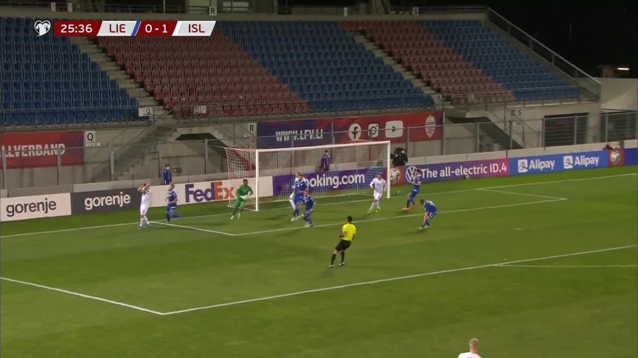 Tiro atajado. Arnór Ingvi Traustason (Islandia) disparo de cabeza desde el centro del área.