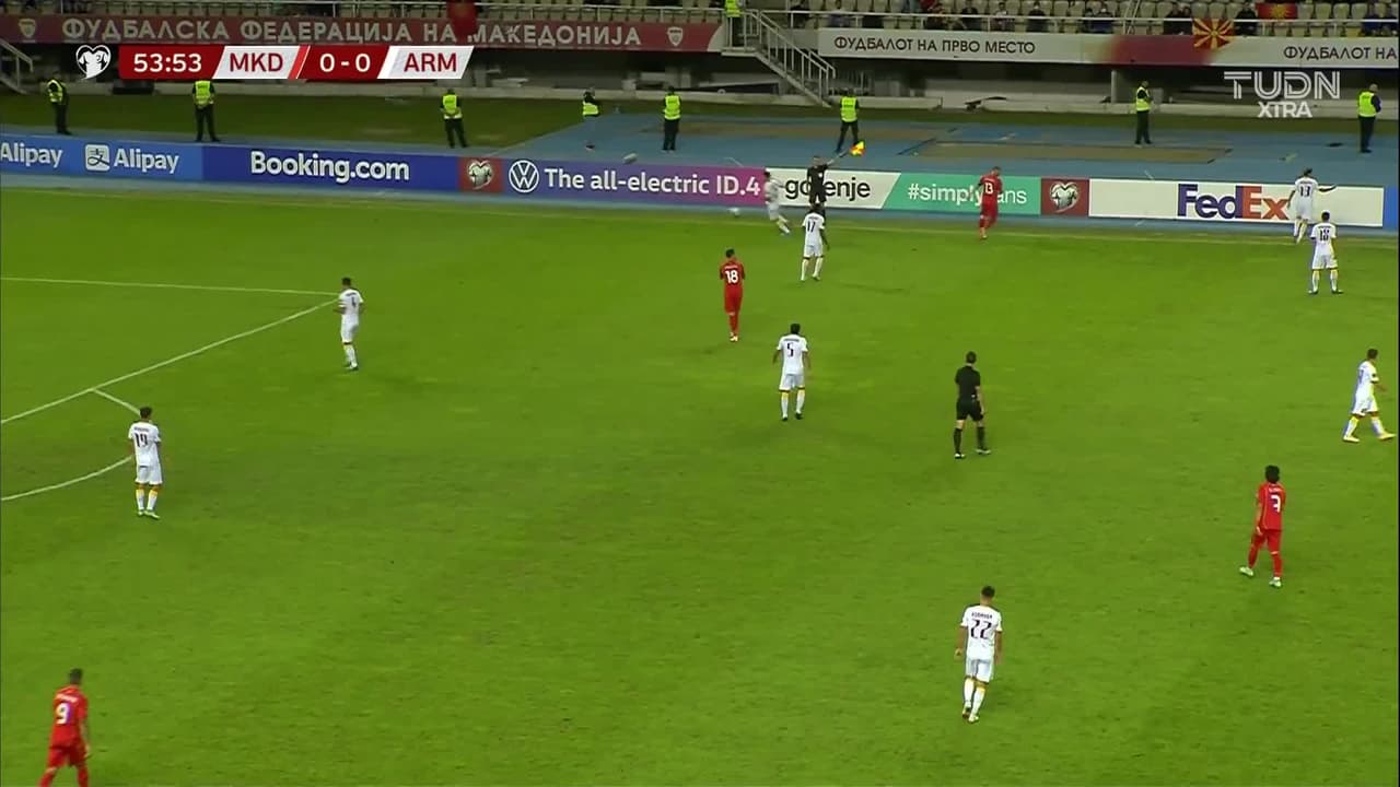 Remate parado junto al lado derecho de la portería. Arshak Koryan (Armenia) remate con la derecha desde el centro del área.