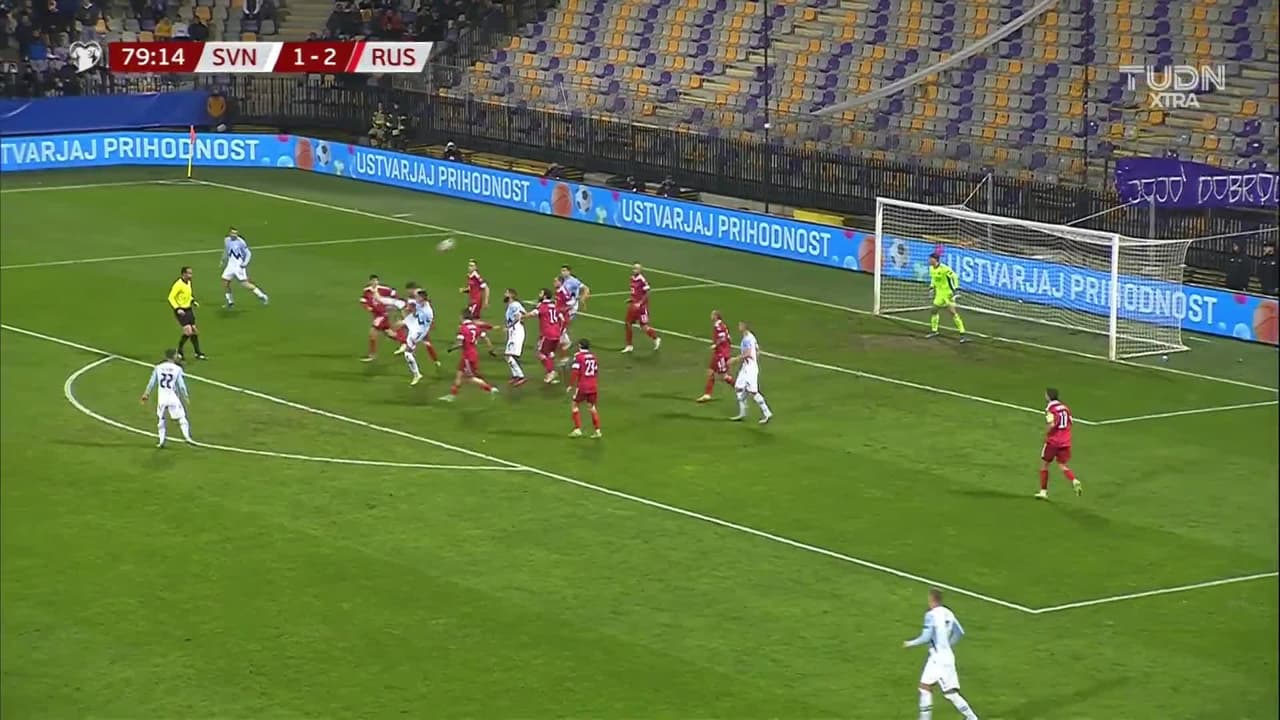 Tiro atajado. Benjamin Sesko (Eslovenia) Disparo con la derecha desde el centro del área.