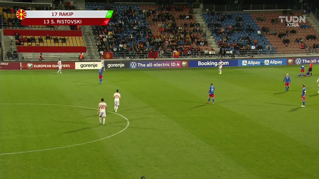 Tiro atajado al ángulo superior derecho. Bojan Miovski (Macedonia) disparo de cabeza desde el centro del área. Asistencia de Stefan Ristovski con un centro al área.