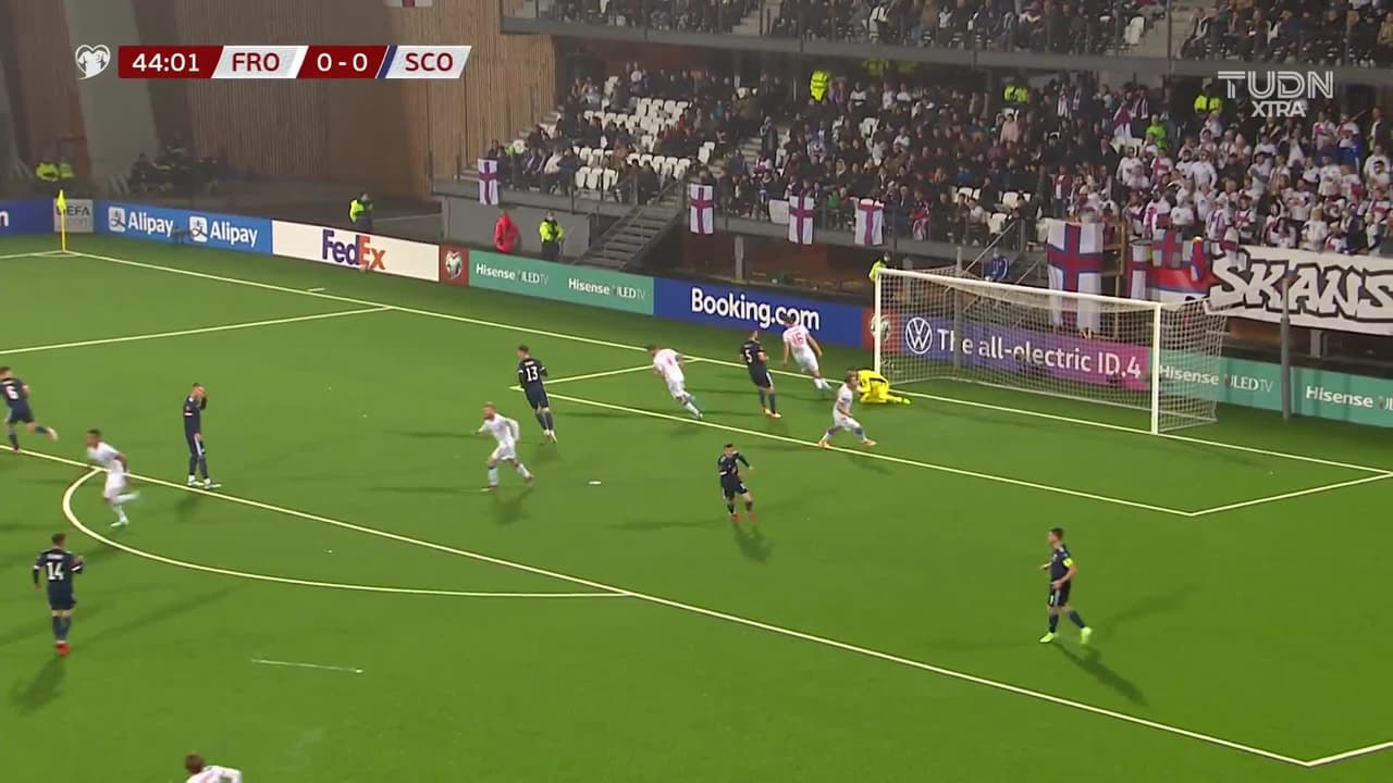 Tiro atajado raso al centro del arco. Brandur Hendriksson Olsen (Islas Faroe) Disparo con la derecha desde fuera del área.