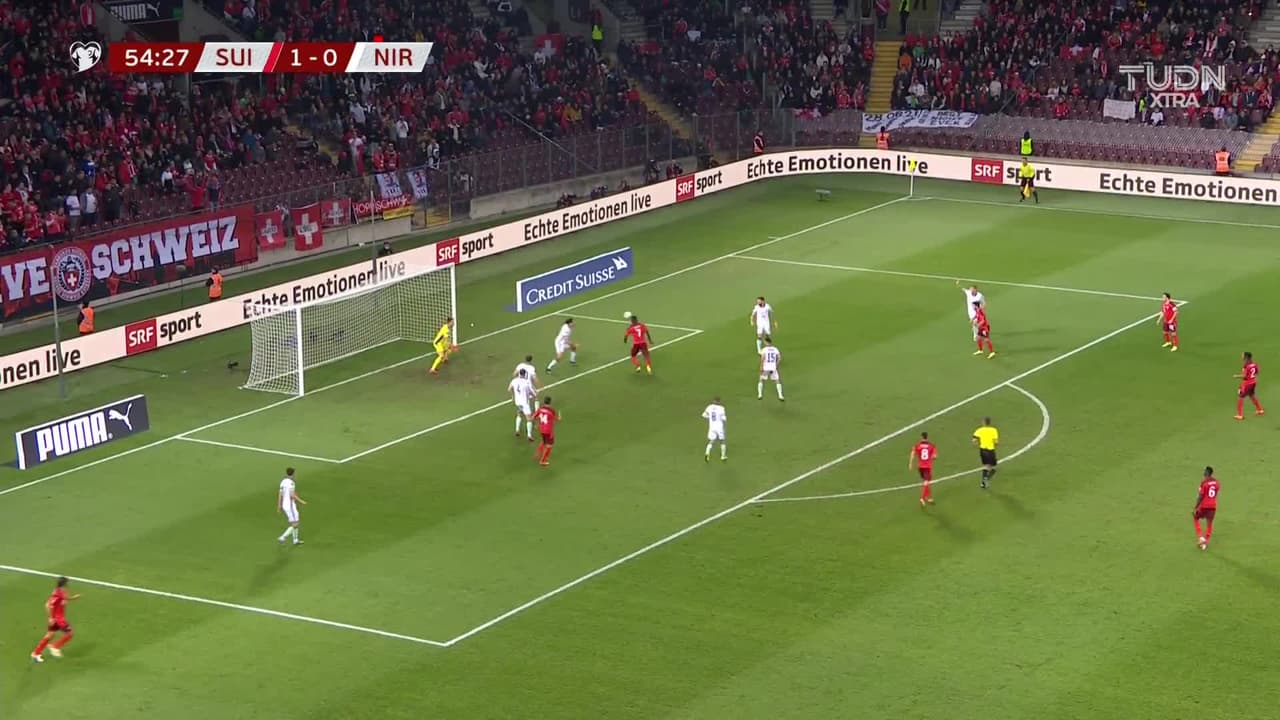 Tiro atajado. Breel Embolo (Suiza) Disparo con la derecha a quemarropa desde el lado derecho.