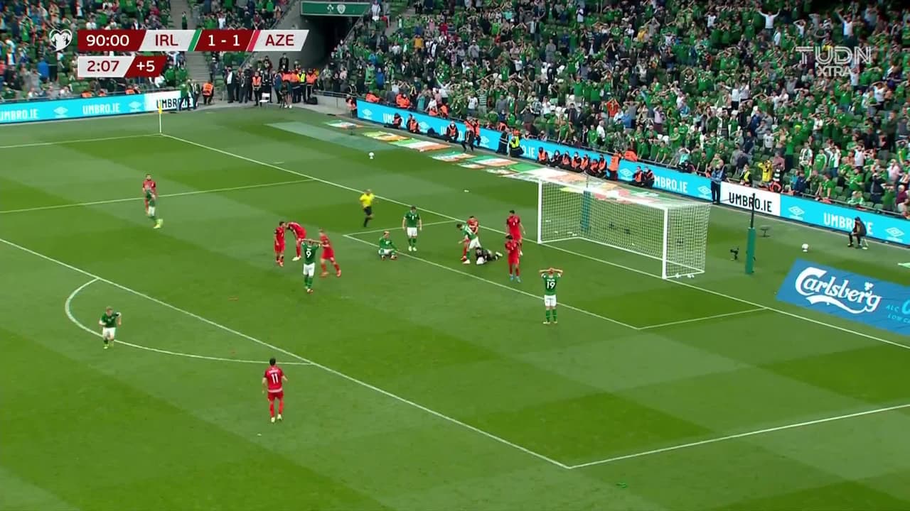 Remate parado bajo palos a rás de suelo. Callum Robinson (Irlanda) remate con la derecha desde el centro del área.