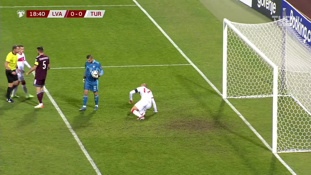 Tiro atajado junto al lado derecho de la portería. Caner Erkin (Turquía) zurdazo desde el lado izquierdo dentro del área. Asistencia de Orkun Kökcü pase largo.