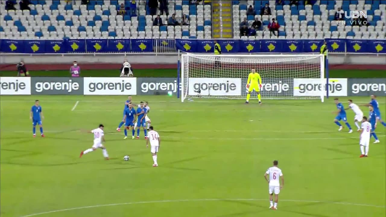 Tiro atajado al ángulo superior derecho. Carlos Soler (España) Disparo con la derecha desde fuera del área.