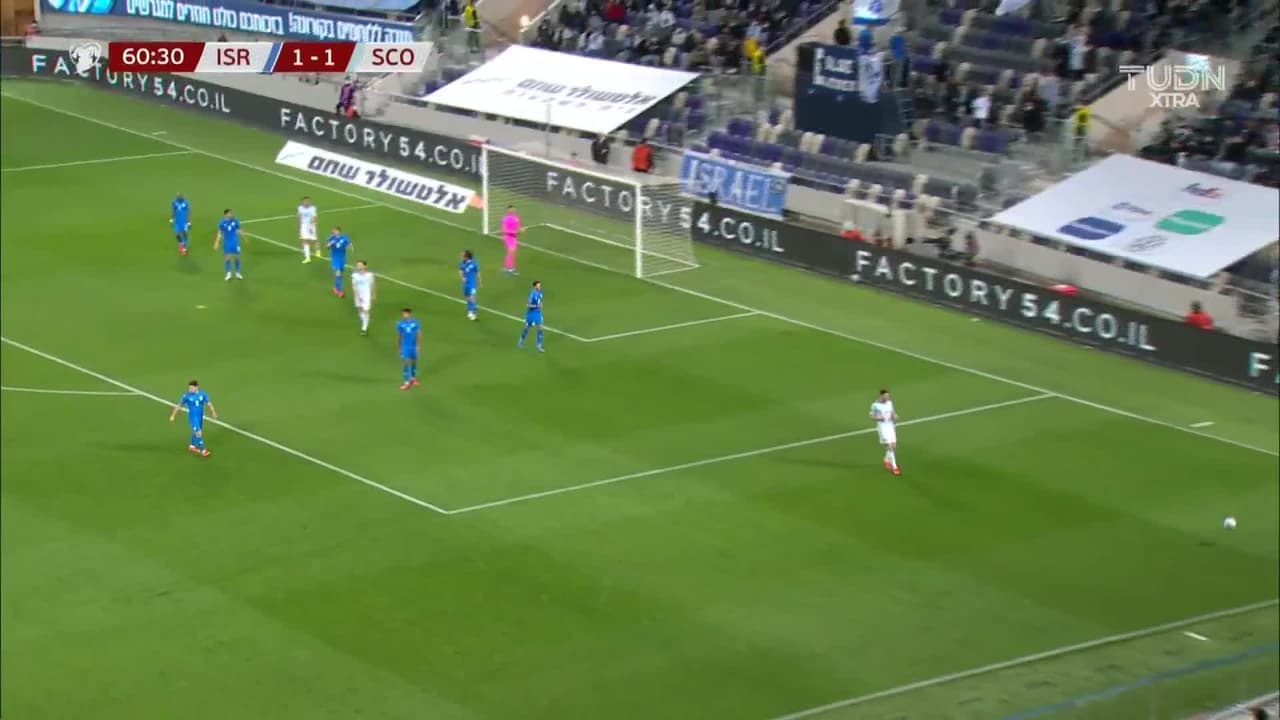 Tiro atajado. Che Adams (Escocia) Disparo con la derecha desde el lado izquierdo dentro del área.