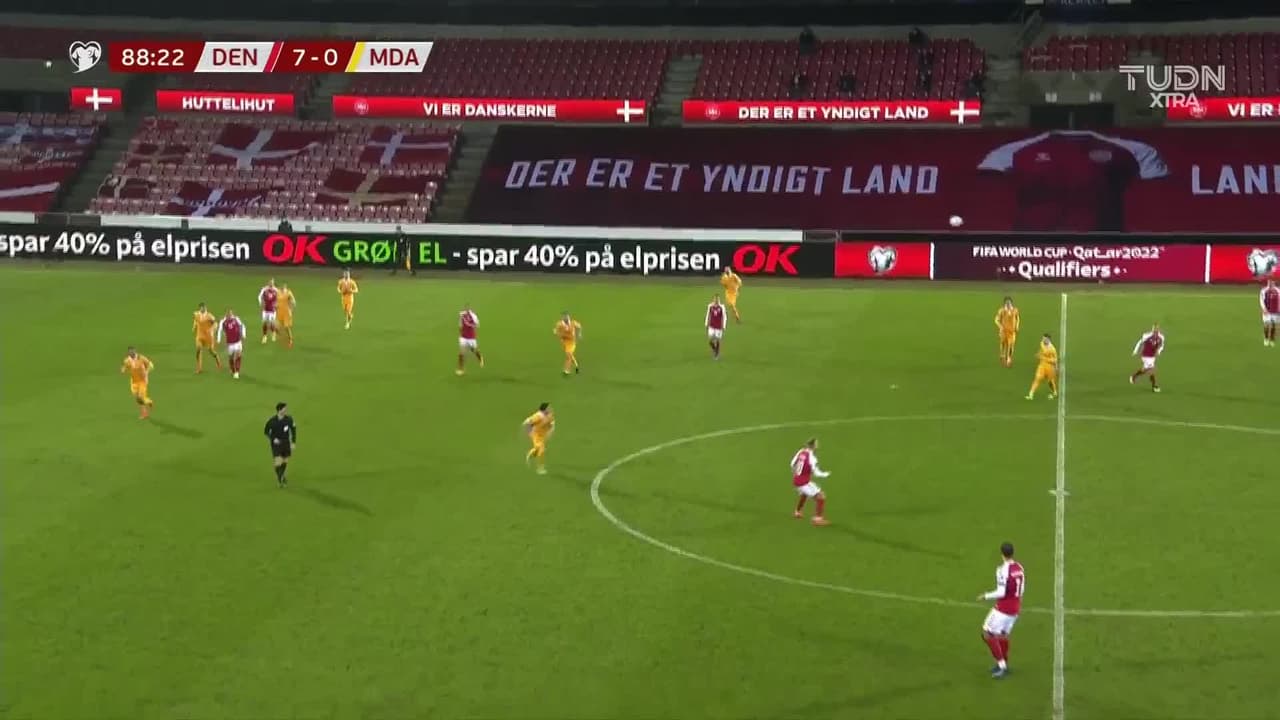 Tiro atajado raso al centro del arco. Christian Eriksen (Dinamarca) Disparo con la derecha desde el centro del área. Asistencia de Kasper Dolberg.