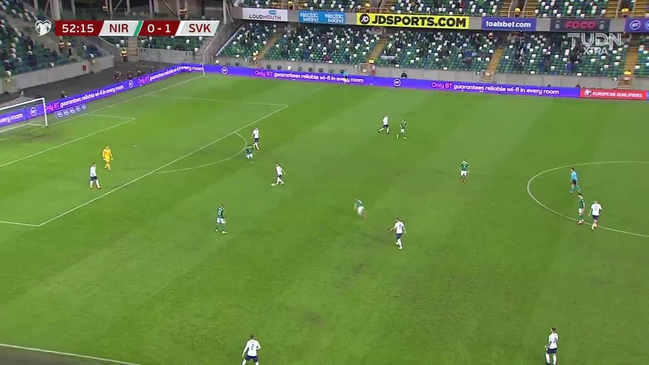 Tiro atajado. Conor Washington (Irlanda del Norte) Disparo con la derecha desde el centro del área.