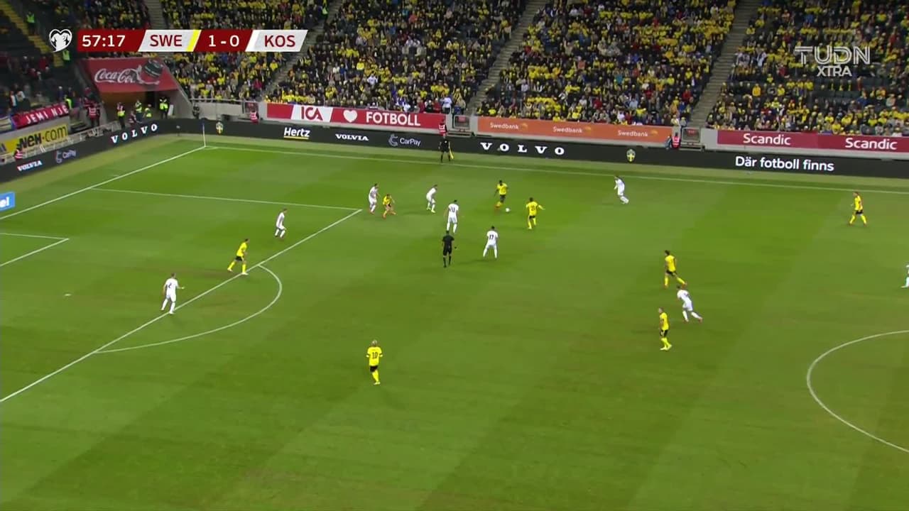 Tiro atajado al ángulo superior derecho. Dejan Kulusevski (Suecia) Disparo con la derecha desde el lado derecho dentro del área. Asistencia de Alexander Isak.