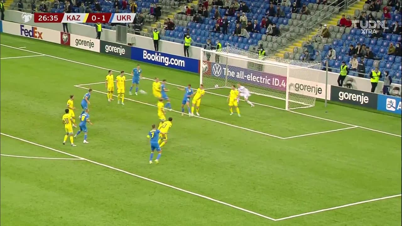 Remate parado bajo palos a rás de suelo. Eduard Sobol (Ucrania) remate de cabeza desde el centro del área.
