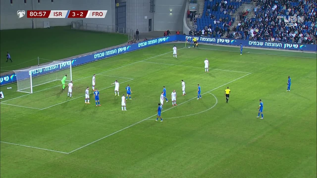 Tiro atajado junto al lado derecho de la portería. Eli Dasa (Israel) Disparo con la derecha desde fuera del área. Asistencia de Dolev Haziza.