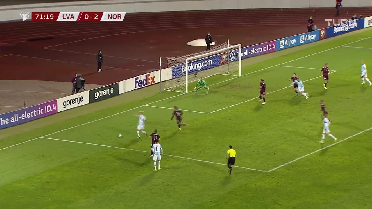 Tiro atajado raso al centro del arco. Erling Haaland (Noruega) zurdazo desde el centro del área.