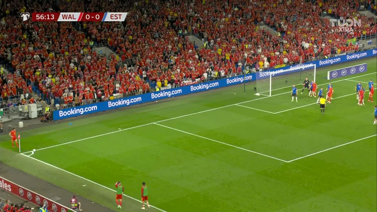 Tiro atajado Por arriba en el centro del arco. Ethan Ampadu (Gales) disparo de cabeza desde el centro del área. Asistencia de Daniel James con un centro al área.