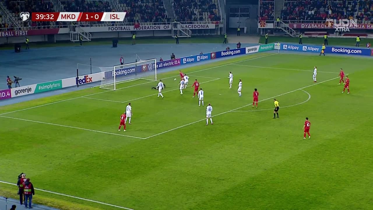 Tiro atajado junto al lado derecho de la portería. Ezgjan Alioski (Macedonia) zurdazo desde el lado izquierdo dentro del área.