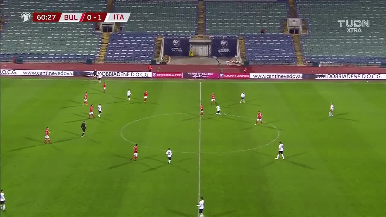 Tiro atajado raso al centro del arco. Federico Chiesa (Italia) Disparo con la derecha desde el lado derecho dentro del área. Asistencia de Stefano Sensi.