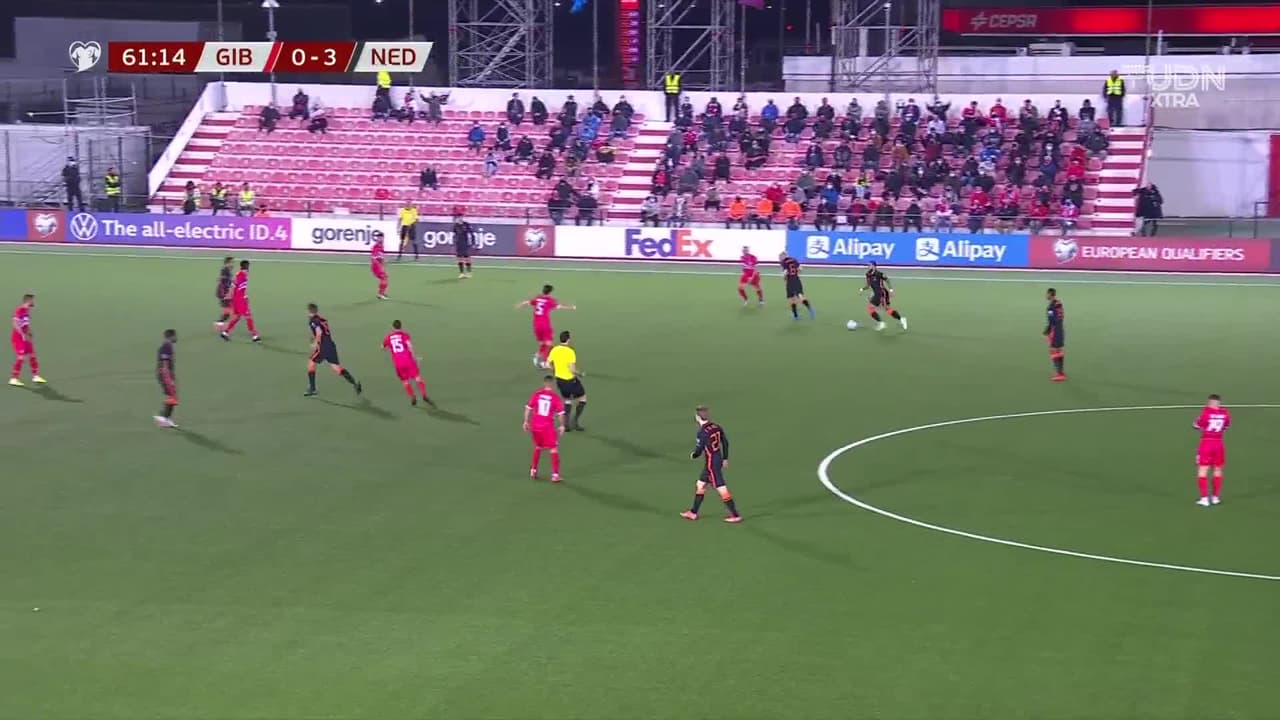 Tiro atajado raso al centro del arco. Georginio Wijnaldum (Holanda) disparo de cabeza desde el centro del área.