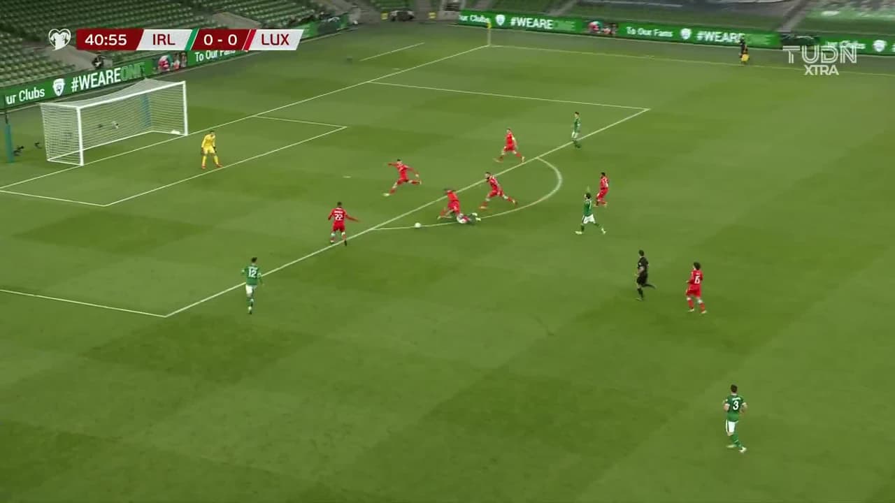 Tiro atajado. Gerson Rodrigues (Luxemburgo) Disparo con la derecha desde fuera del área.