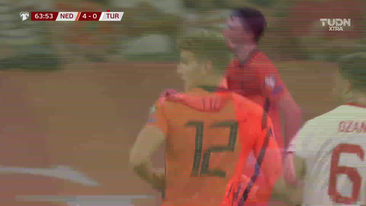 Tiro atajado Por arriba en el centro del arco. Guus Til (Holanda) disparo de cabeza desde el centro del área. Asistencia de Steven Berghuis pase largo.
