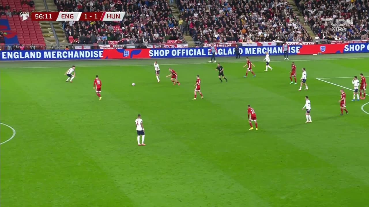 Tiro atajado raso al centro del arco. Harry Kane (Inglaterra) Disparo con la derecha desde fuera del área. Asistencia de Jack Grealish.