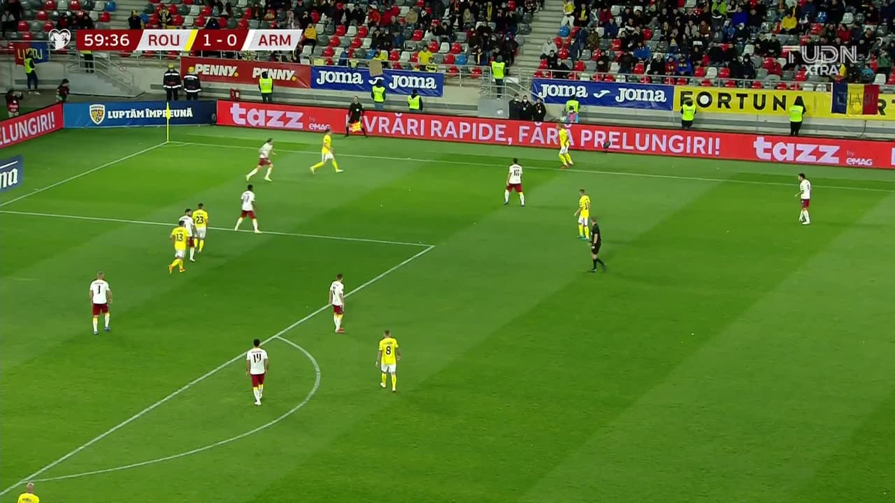 Tiro atajado raso al centro del arco. Ianis Hagi (Rumanía) zurdazo desde fuera del área.