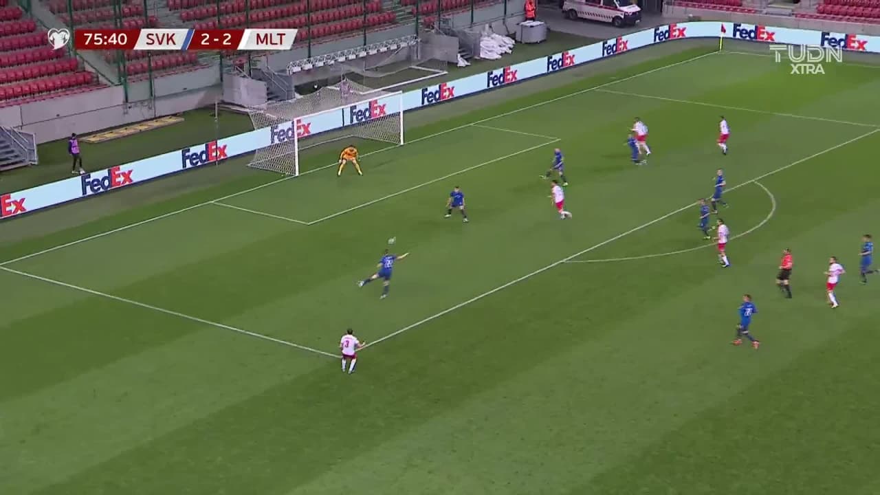 Tiro atajado raso al centro del arco. Jake Grech (Malta) Disparo con la derecha desde el lado derecho dentro del área.
