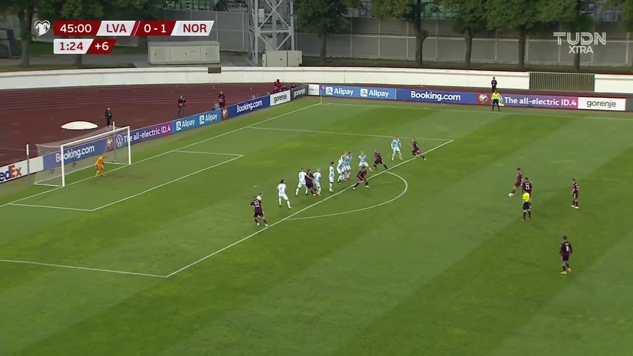 Remate parado junto al lado derecho de la portería. Janis Ikaunieks (Letonia) remate con la izquierda desde fuera del área.