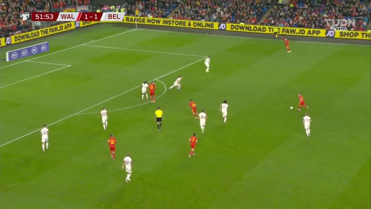 Tiro atajado al ángulo superior derecho. Joe Morrell (Gales) Disparo con la derecha desde fuera del área. Asistencia de Joe Allen.