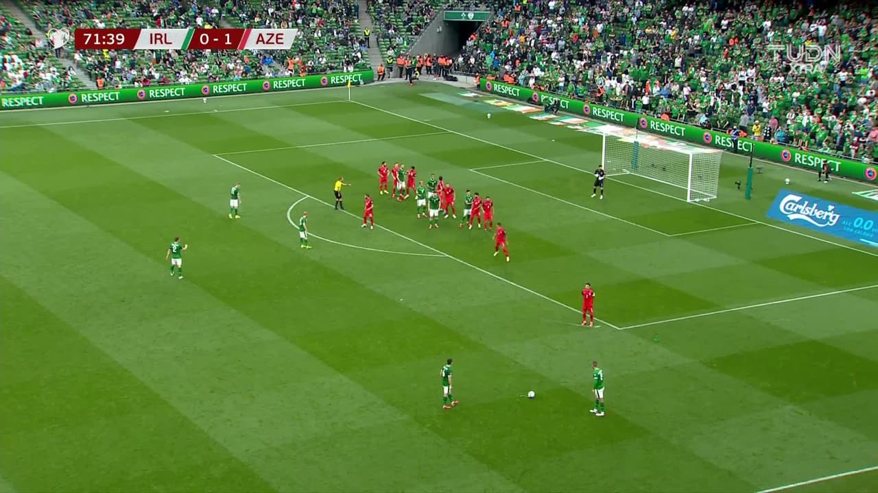 Remate parado bajo palos a rás de suelo. John Egan (Irlanda) remate de cabeza desde el centro del área. Asistencia de Conor Hourihane con un centro al área.