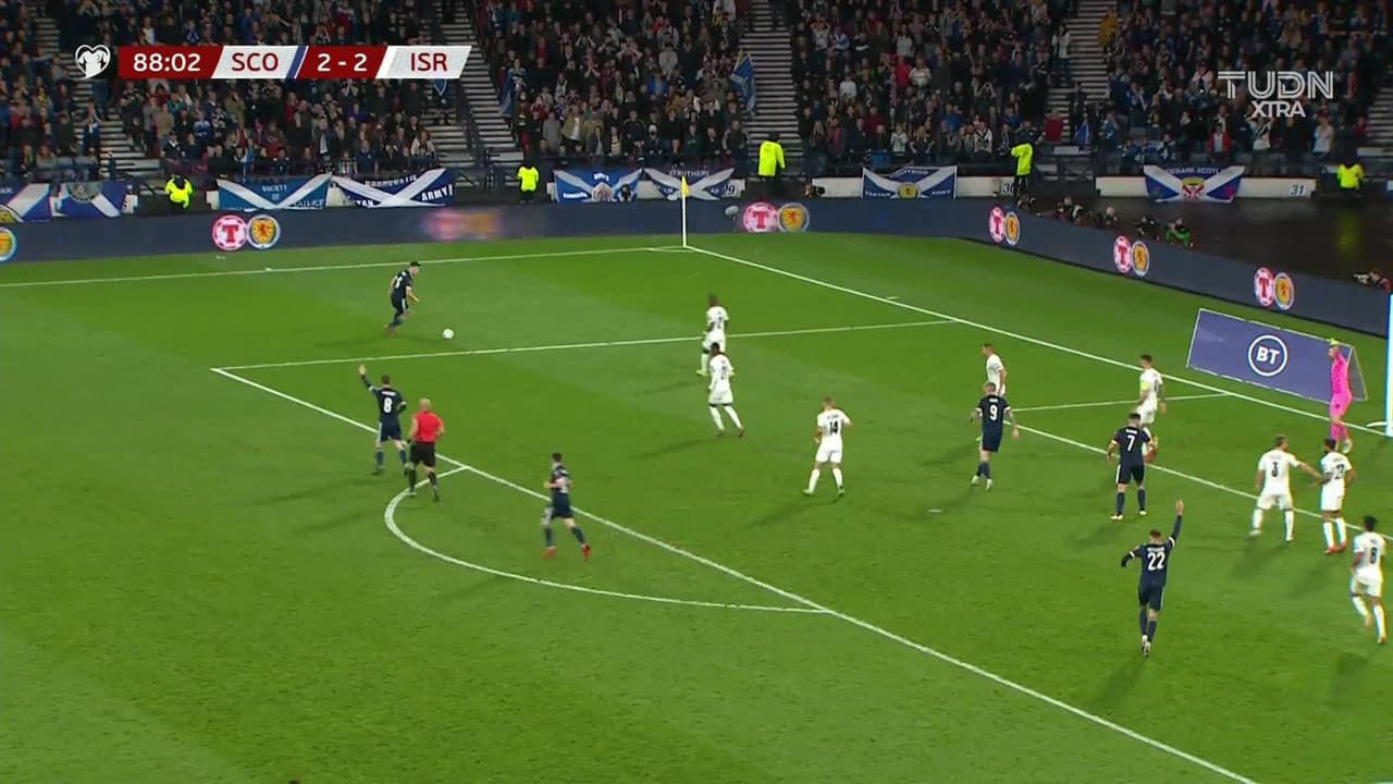 Tiro atajado raso al centro del arco. John McGinn (Escocia) Disparo con la derecha desde el centro del área. Asistencia de Ryan Christie.