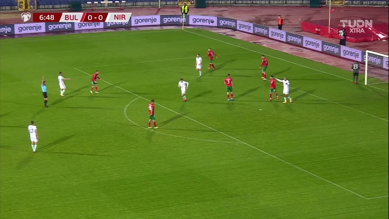Tiro atajado junto al lado derecho de la portería. Jordan Thompson (Irlanda del Norte) zurdazo desde fuera del área.