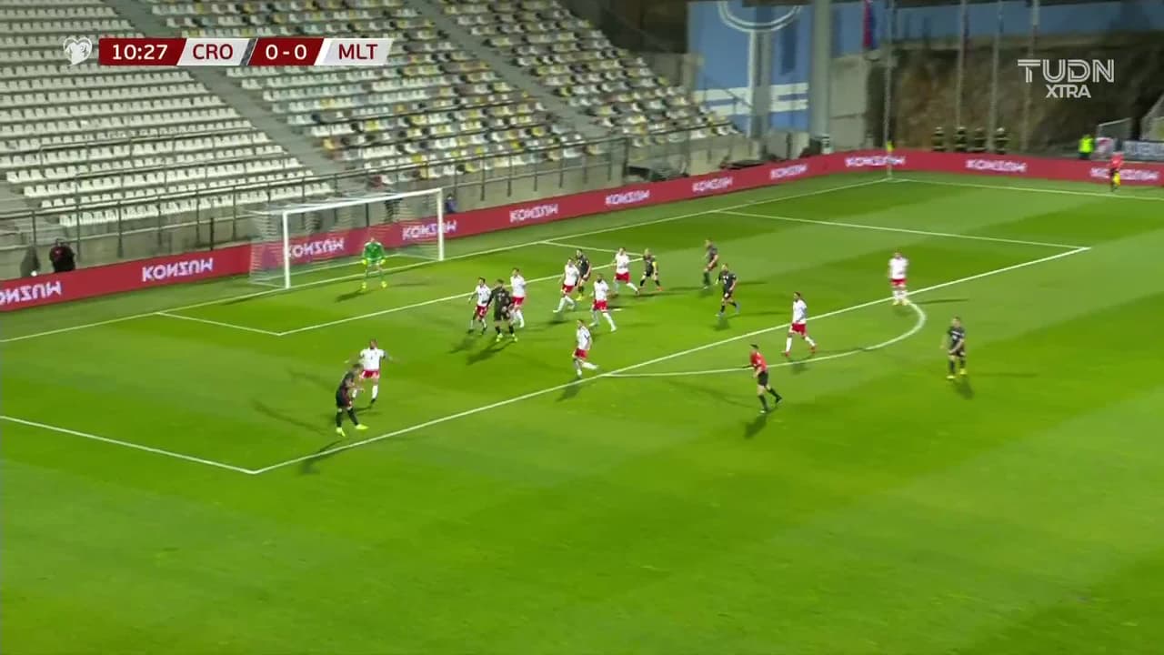 Tiro atajado raso al centro del arco. Joseph Mbong (Malta) zurdazo desde el lado izquierdo dentro del área.