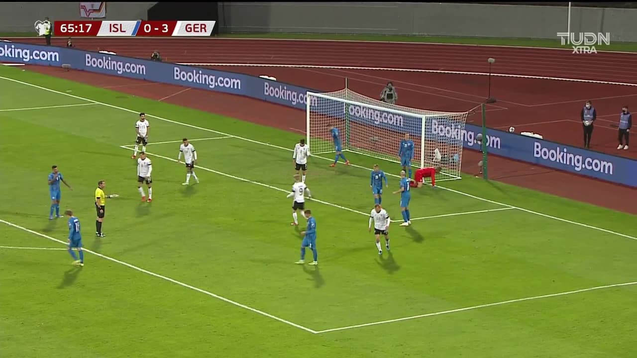 Remate parado bajo palos a rás de suelo. Kai Havertz (Alemania) remate de cabeza desde el centro del área.