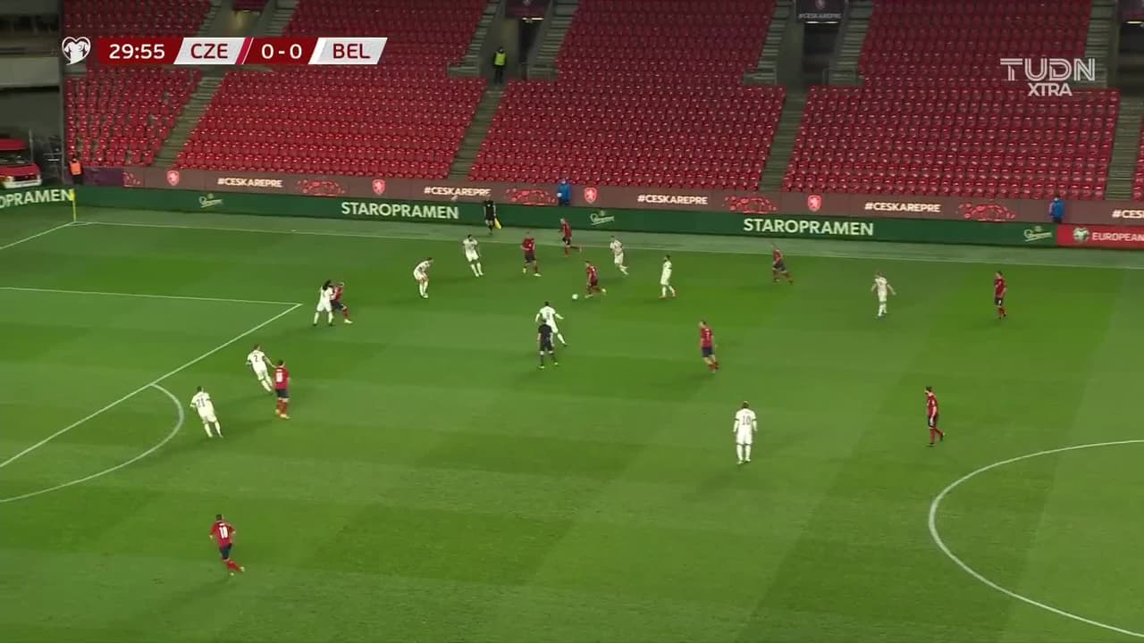 Tiro atajado raso al centro del arco. Kevin De Bruyne (Bélgica) disparo de cabeza desde el centro del área. Asistencia de Romelu Lukaku con un centro al área.