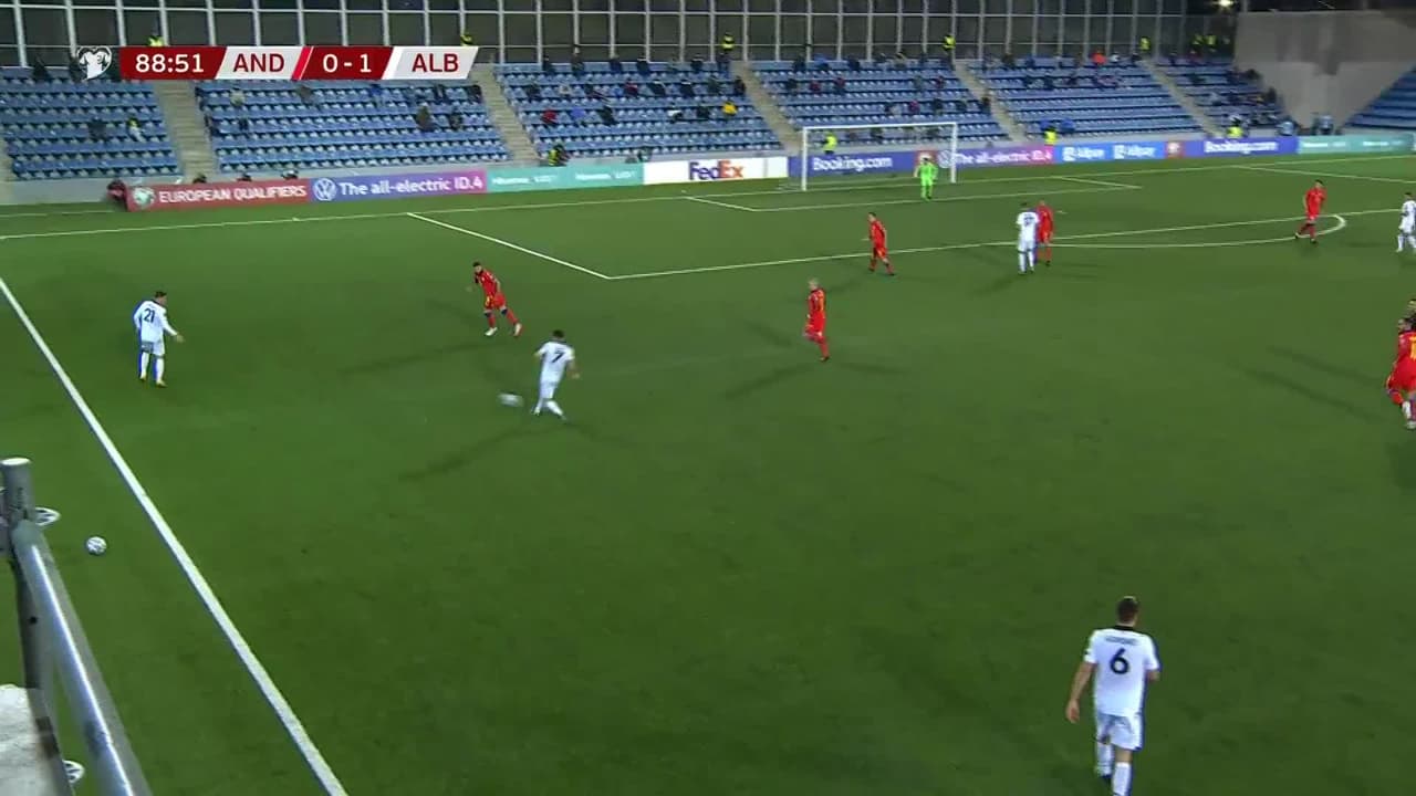Tiro atajado Por arriba en el centro del arco. Klaus Gjasula (Albania) Disparo con la derecha desde fuera del área. Asistencia de Odise Roshi.