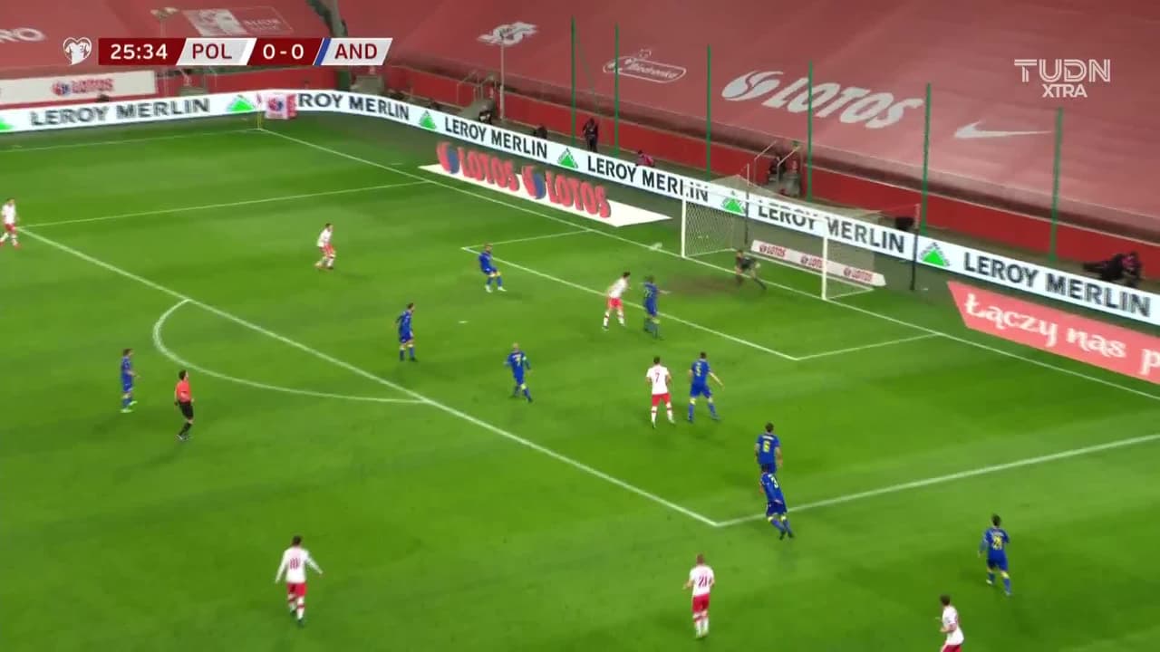 Tiro atajado Por arriba en el centro del arco. Krzysztof Piatek (Polonia) disparo de cabeza desde el centro del área. Asistencia de Kamil Jozwiak con un centro al área.