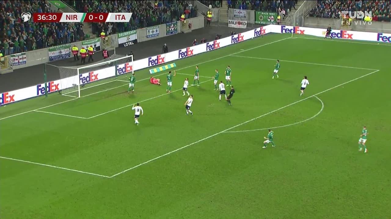 Tiro atajado junto al lado derecho de la portería. Lorenzo Insigne (Italia) Disparo con la derecha desde el centro del área. Asistencia de Domenico Berardi.