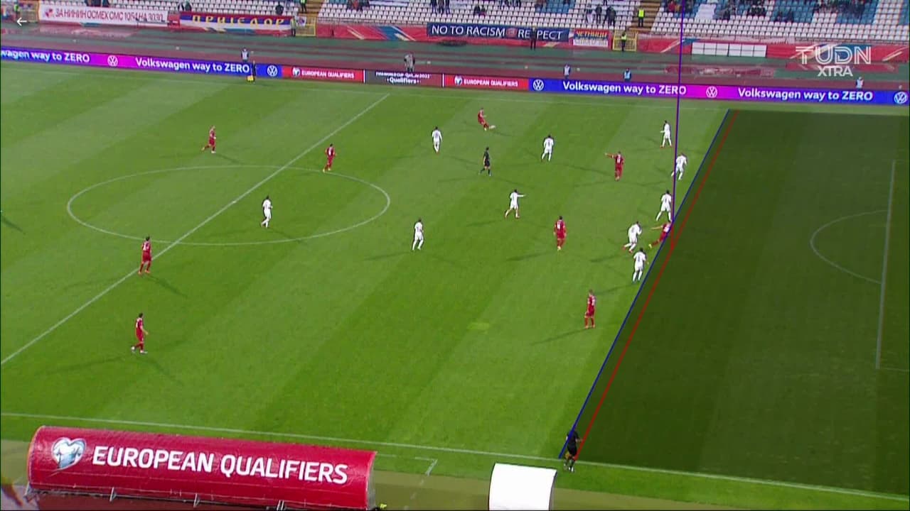 Tiro atajado Por arriba en el centro del arco. Luka Jovic (Serbia) disparo de cabeza desde el centro del área. Asistencia de Darko Lazovic.