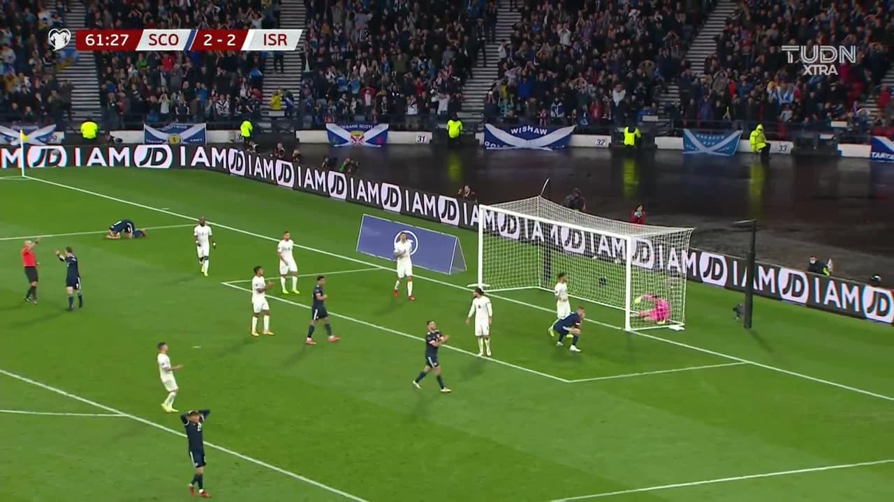 Tiro atajado al ángulo superior derecho. Lyndon Dykes (Escocia) disparo de cabeza desde muy cerca. Asistencia de Kieran Tierney con un centro al área.