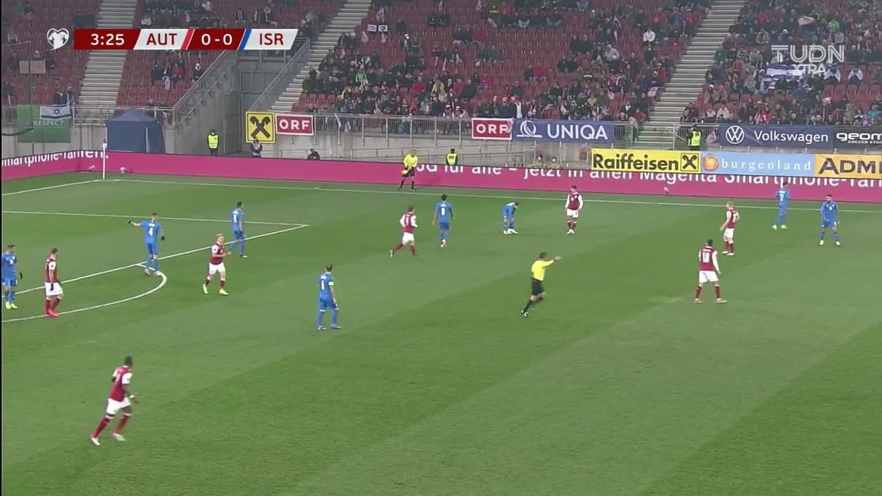 Tiro atajado junto al lado derecho de la portería. Marcel Sabitzer (Austria) zurdazo desde el centro del área.