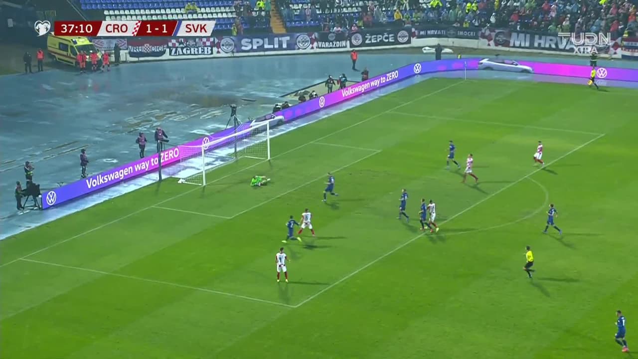 Tiro atajado. Marcelo Brozovic (Croacia) zurdazo desde fuera del área.
