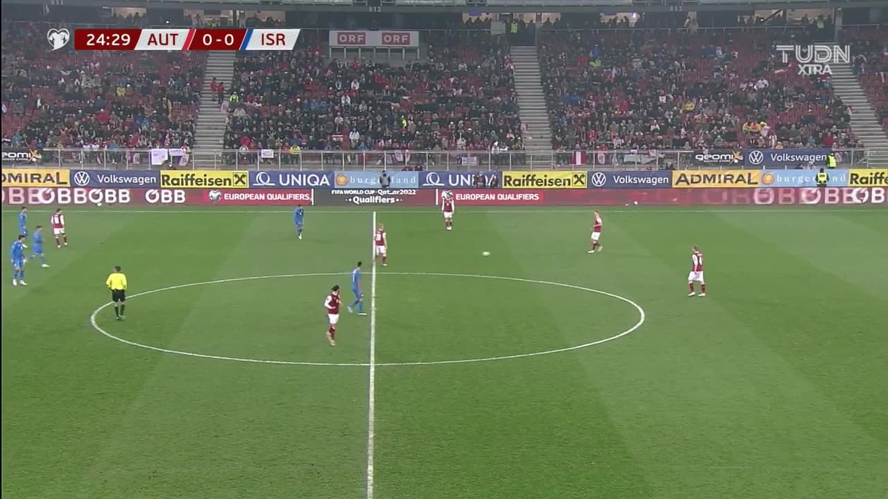 Tiro atajado raso al centro del arco. Marco Grüll (Austria) Disparo con la derecha desde fuera del área. Asistencia de Marko Arnautovic con un pase de cabeza.