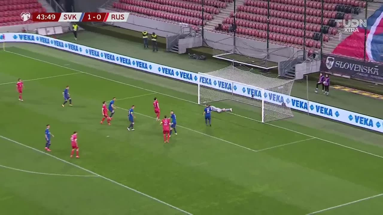 Tiro atajado. Mario Fernandes (Rusia) disparo de cabeza desde el centro del área.