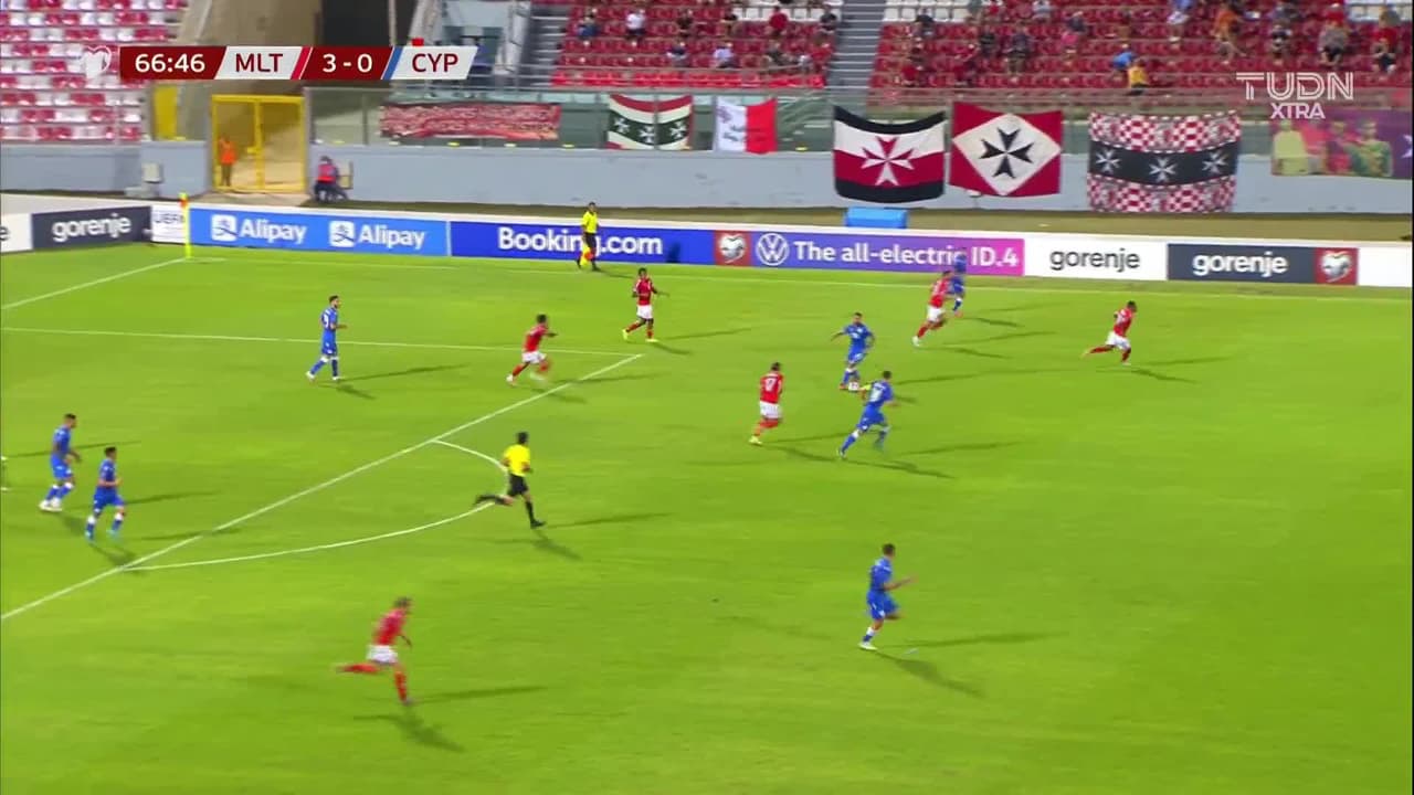 Remate parado bajo palos a rás de suelo. Marios Ilia (Chipre) remate con la derecha desde mas de 30 metros. Asistencia de Kostakis Artymatas.