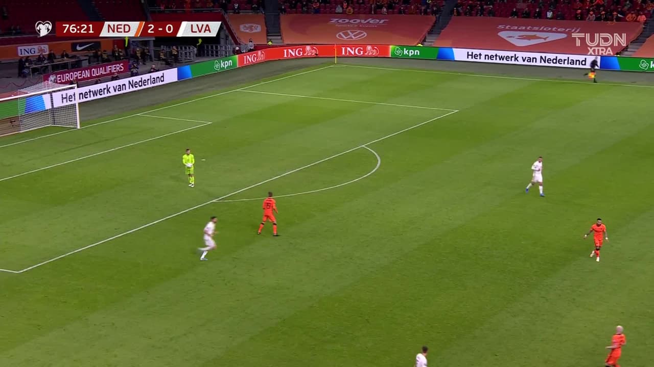 Tiro atajado raso al centro del arco. Memphis Depay (Holanda) zurdazo desde el centro del área. Asistencia de Georginio Wijnaldum.