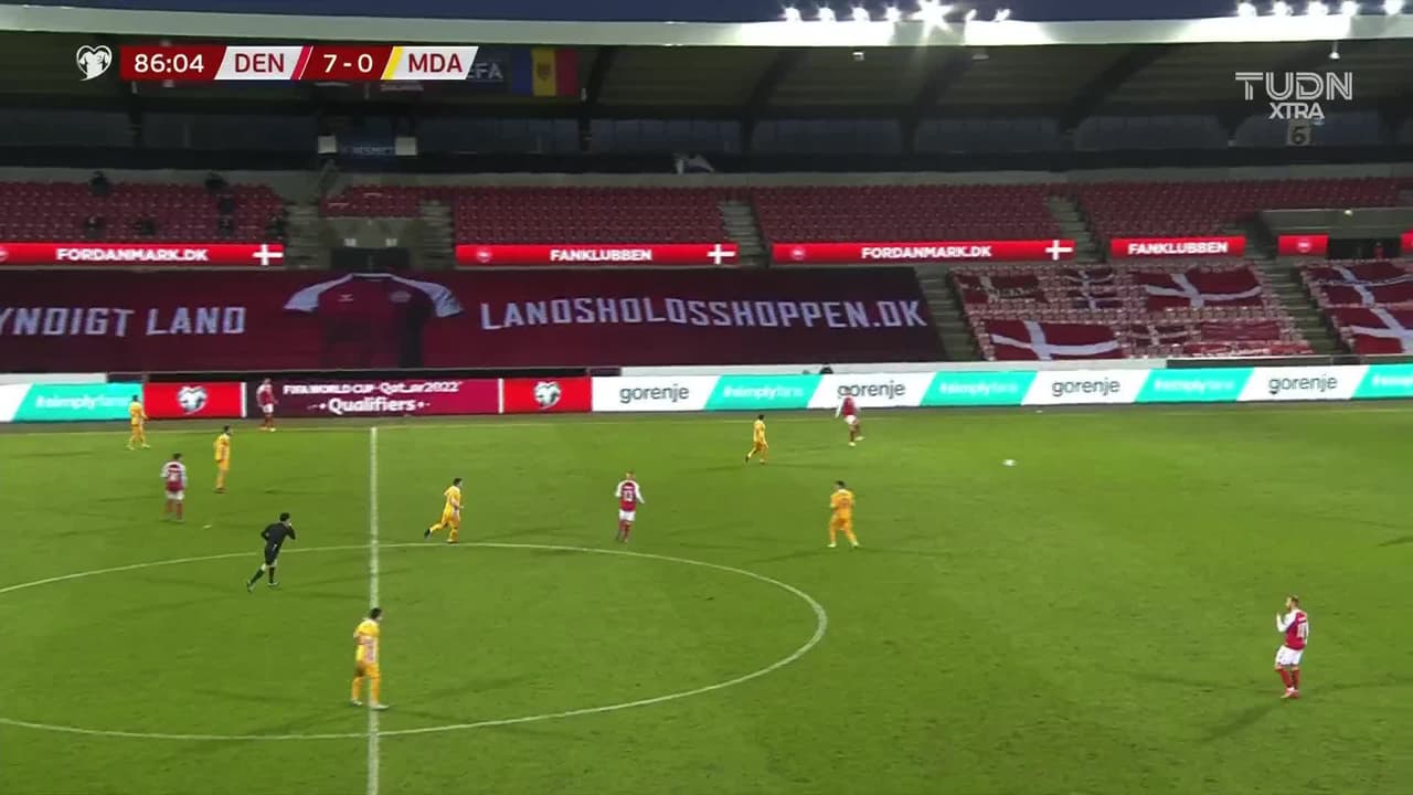 Tiro atajado. Mikkel Damsgaard (Dinamarca) Disparo con la derecha desde el centro del área.
